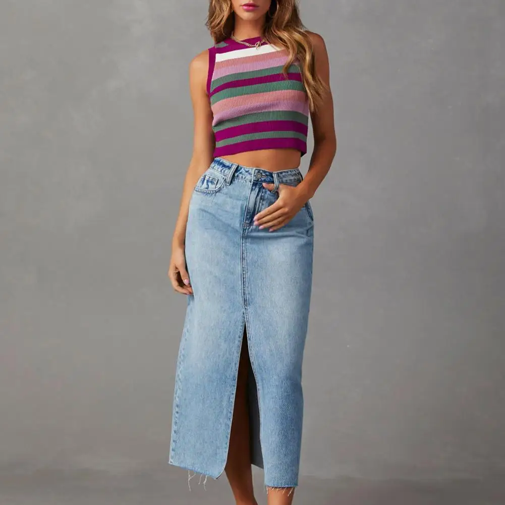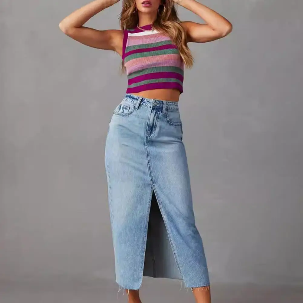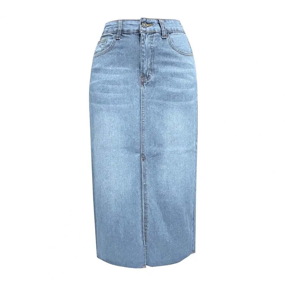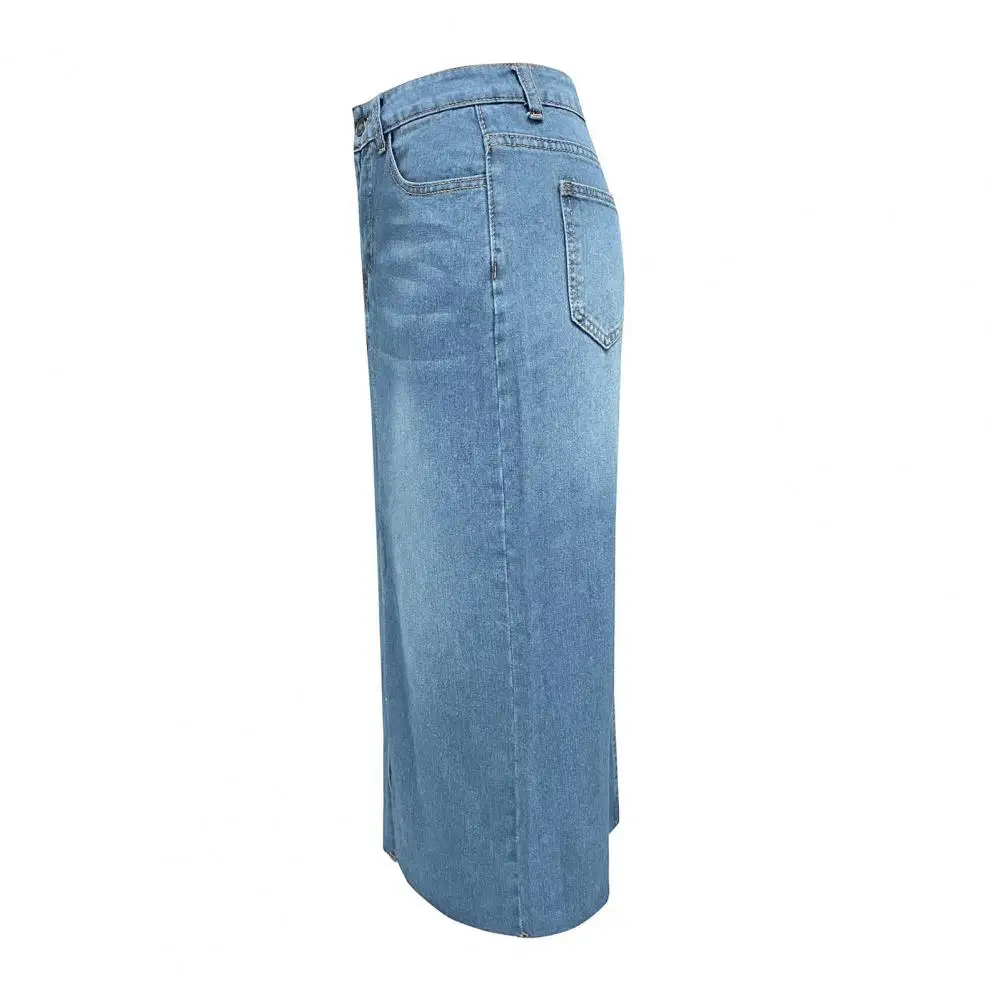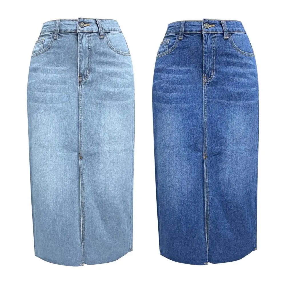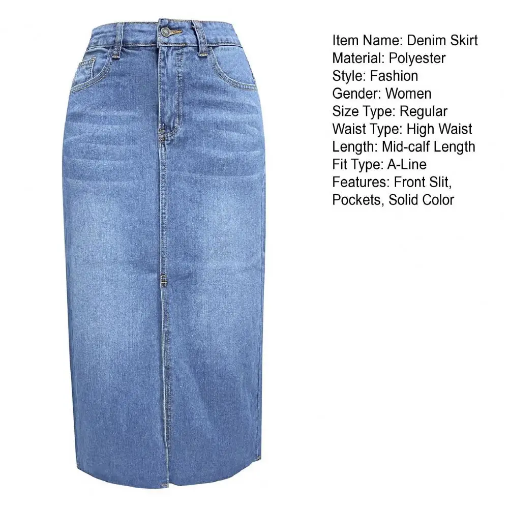 Center Slit Denim Skirt Trendy High Waist Denim Skirt with Front Slit Pockets Women's A-line Midi Skirt for Summer Streetwear