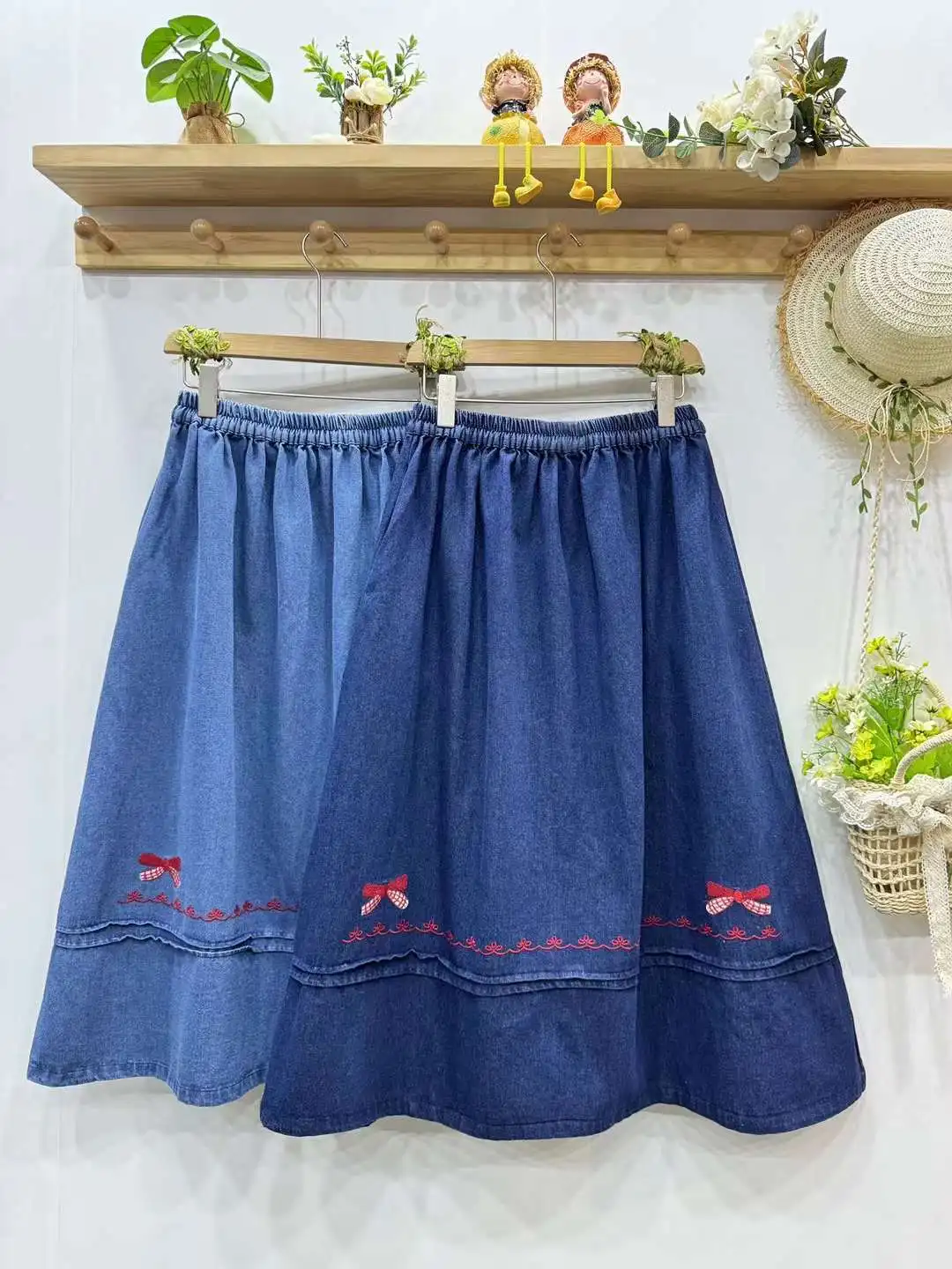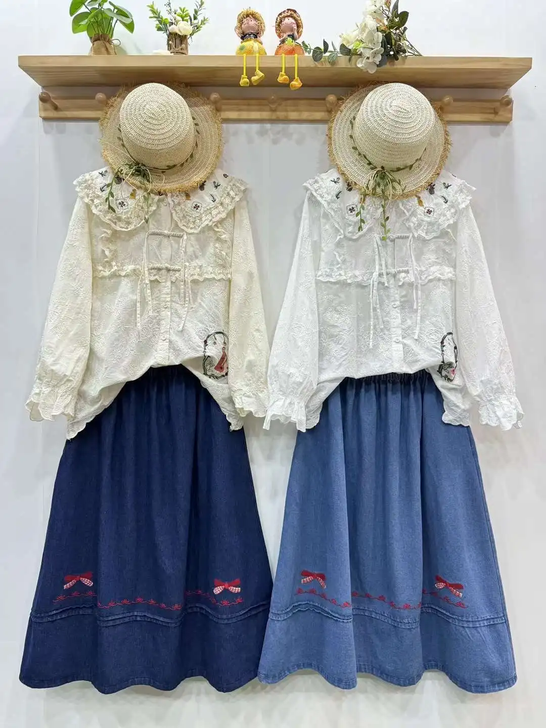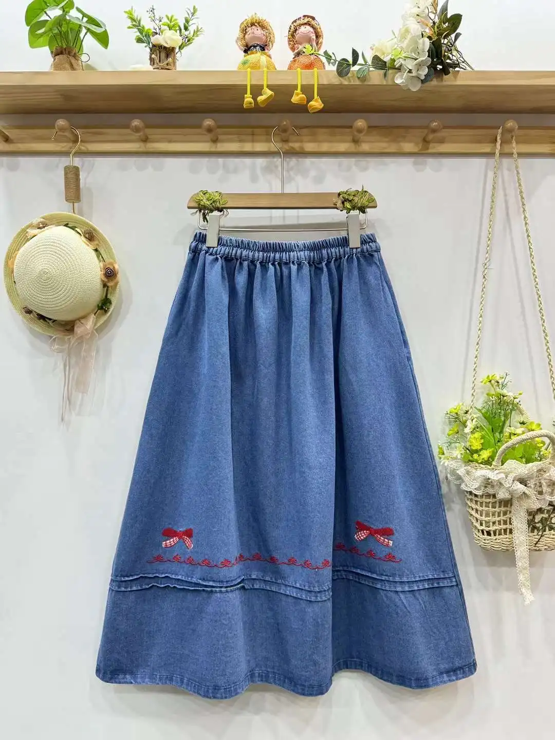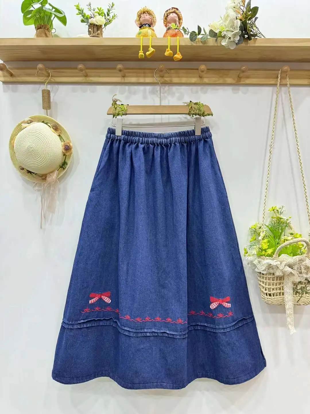 Mori Girl Sweet Bow Embroider Long Denim Skirt Woman Japan Style Cotton Princess Midi Skirts Jean Skirt Faldas Mujer