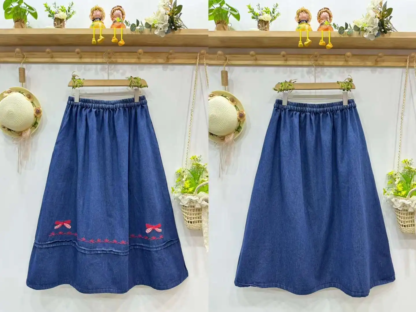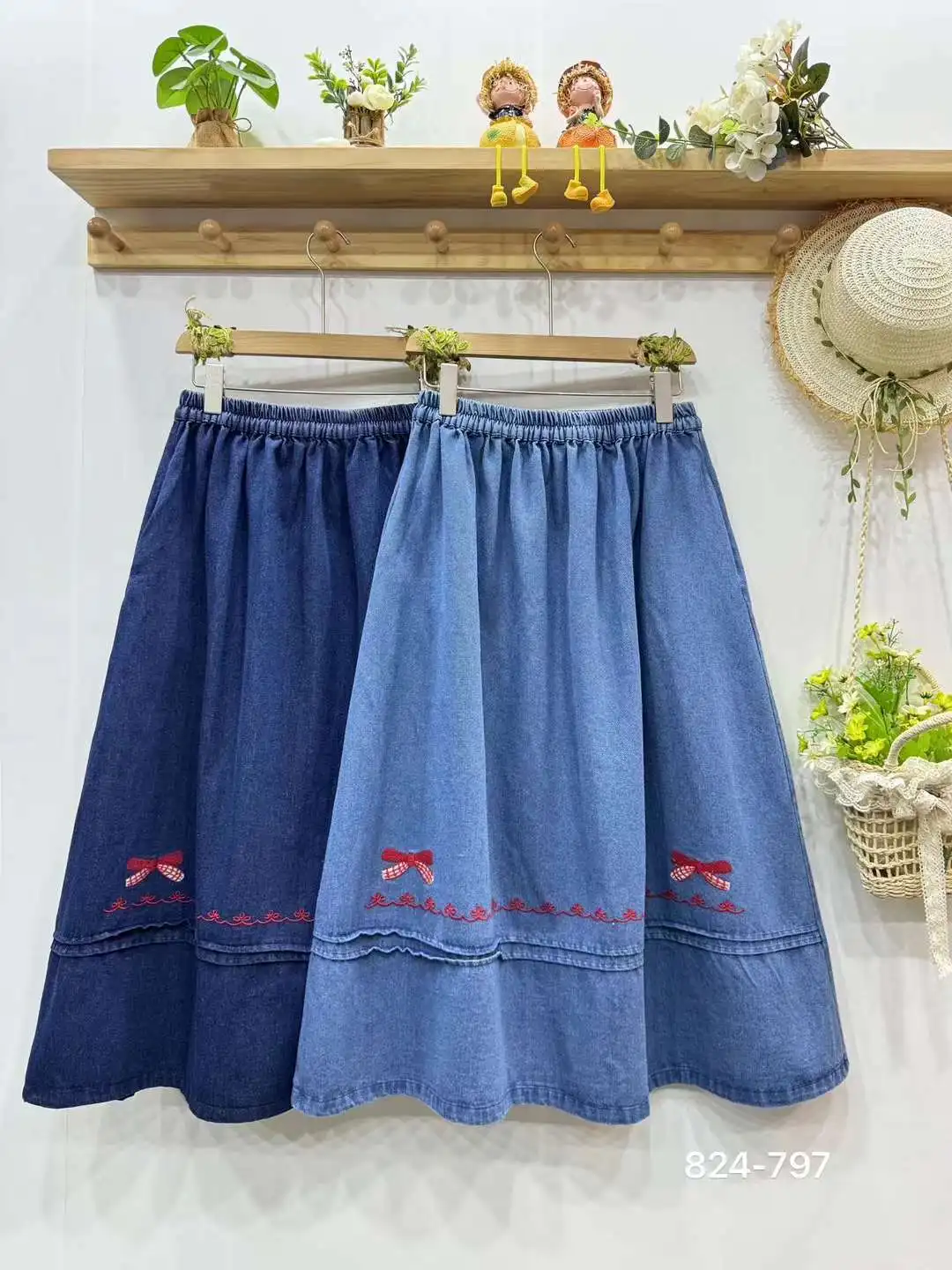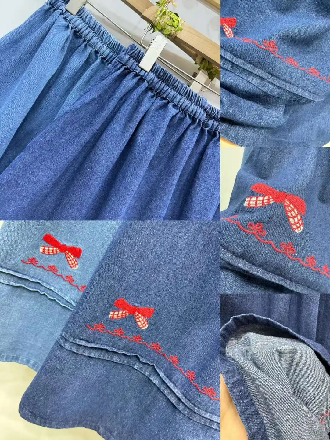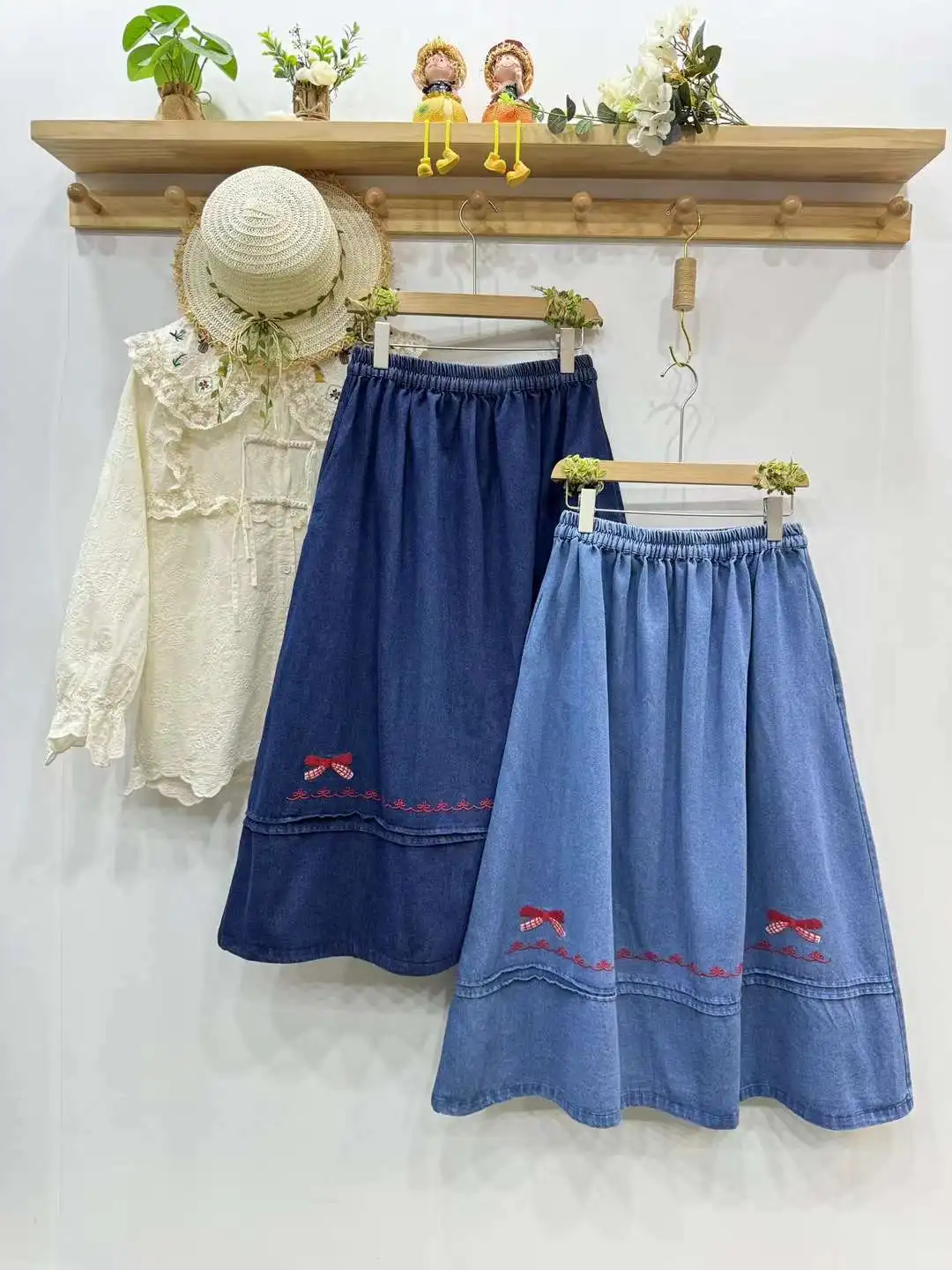 Mori Girl Sweet Bow Embroider Long Denim Skirt Woman Japan Style Cotton Princess Midi Skirts Jean Skirt Faldas Mujer