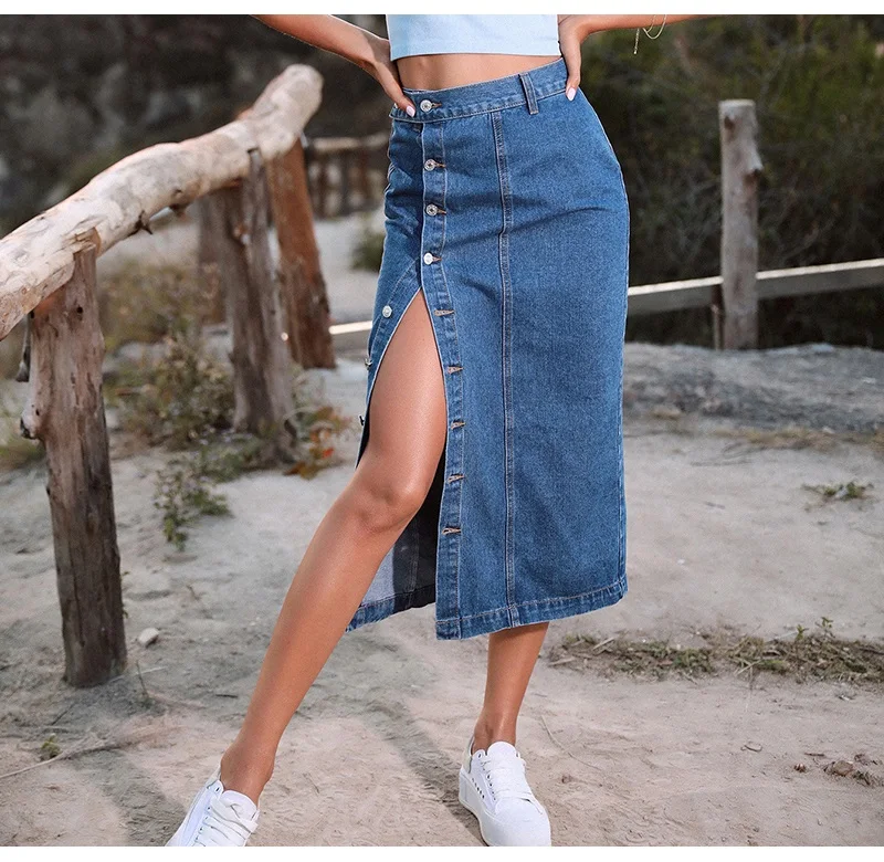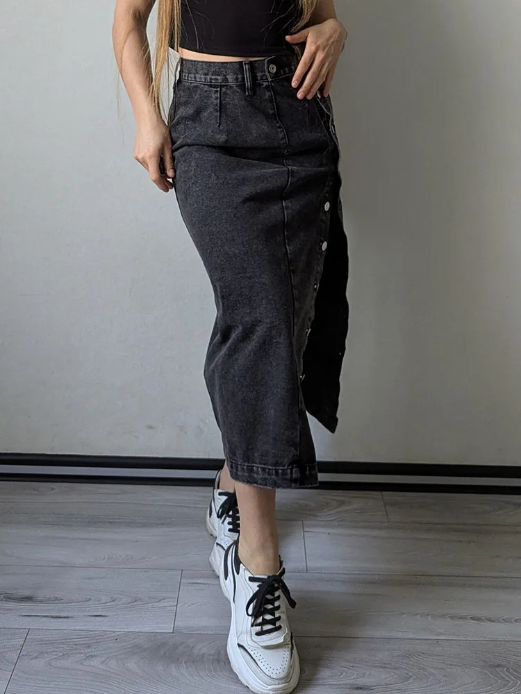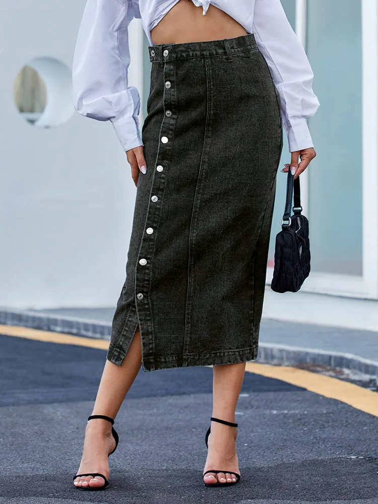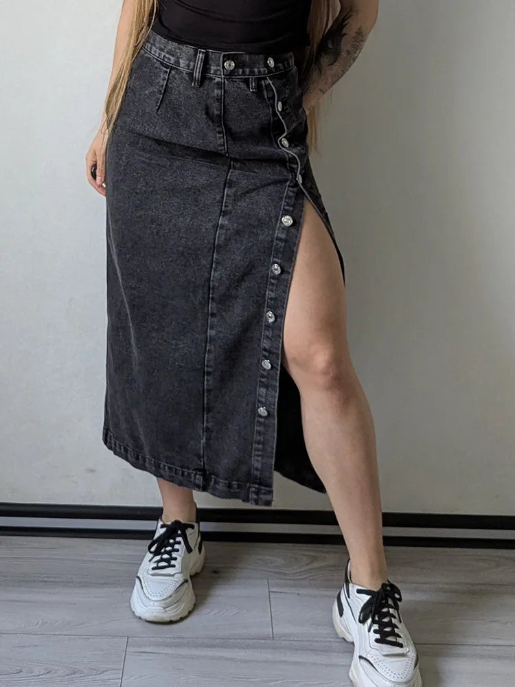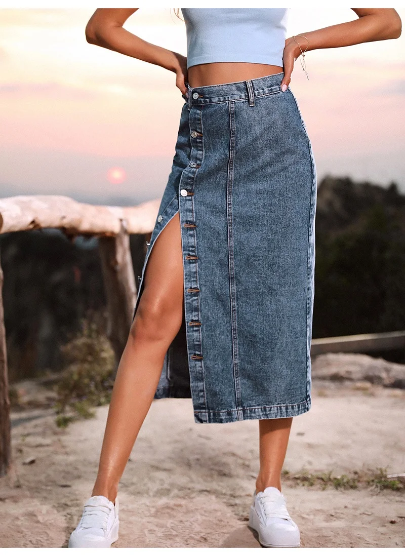 Women Midi Denim Skirt High Waist Summer Long Black Button Jeans Skirt Woman Casual A Line Slit Maxi Denim Skirts For Women