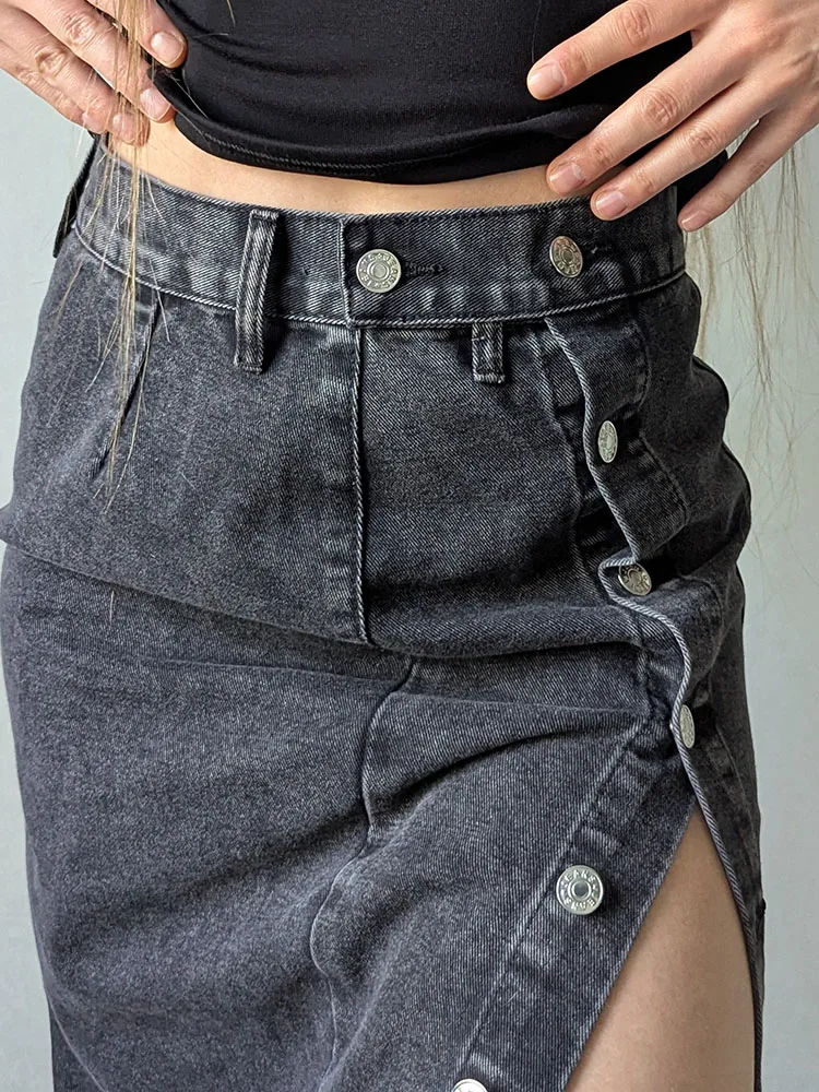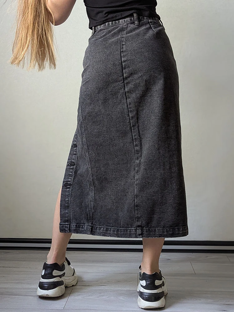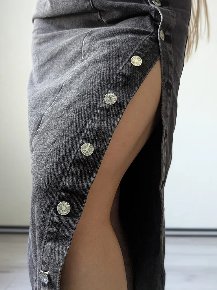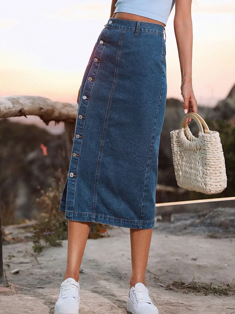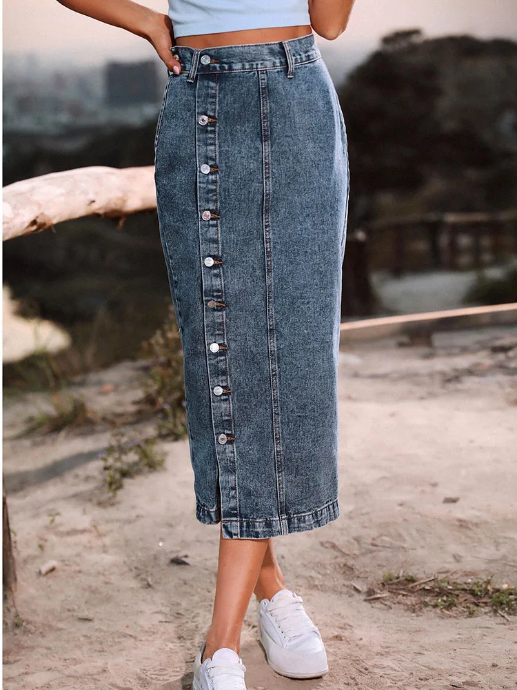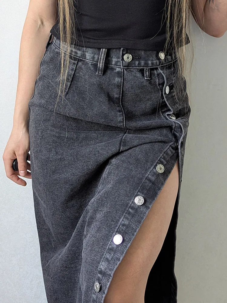 Women Midi Denim Skirt High Waist Summer Long Black Button Jeans Skirt Woman Casual A Line Slit Maxi Denim Skirts For Women
